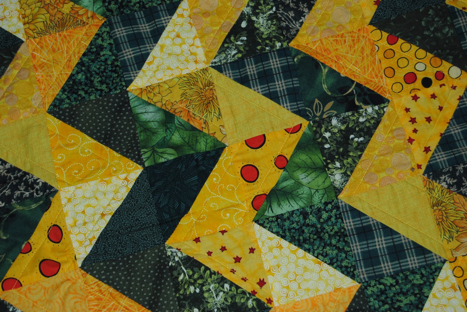 The runner was made from scraps after a lap quilt that I have been sewing (not finished yet), and I embellished it with a fabric/button flower.